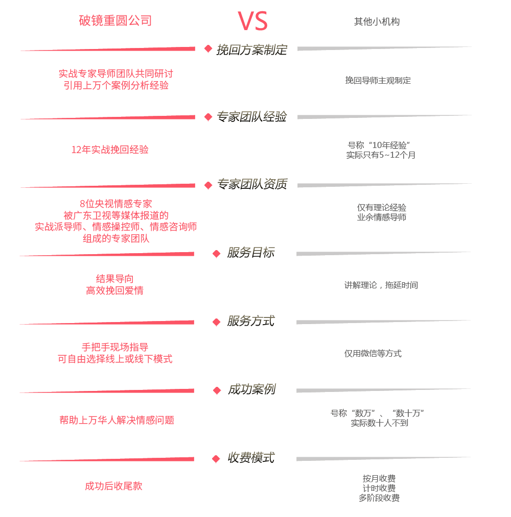 你对待伴侣的方式,决定你们分手的方式。但这个真实的分手理由往往不会被公开,分手时对方说的理由都是无关的理由。所以往往你去对这个假理由解释,而对方却由于你不知道真实理由而更加坚定自己的分手的决定。破镜重圆导师团深入分析双方关系演变进程,帮你找出导致你们分手的源头,解决真正的问题。